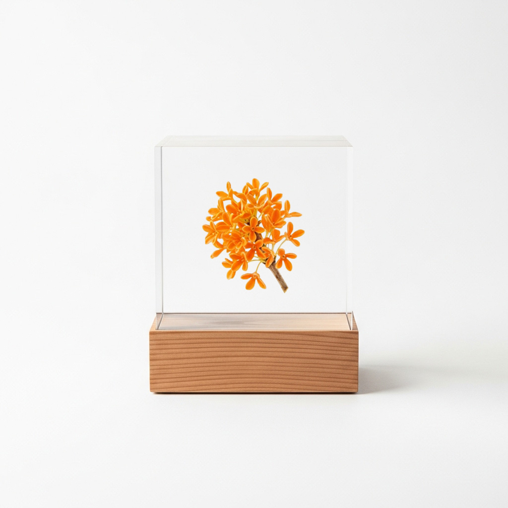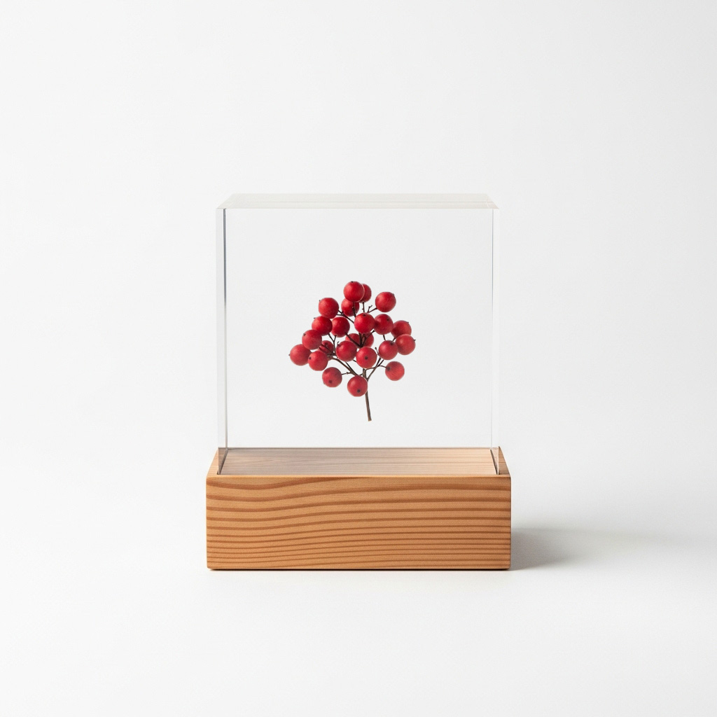 土台に使用したのは、宮崎県産の飫肥杉。 数十年の歳月を刻んだ木肌の上に、 花や実など、自然の断片をのせています。